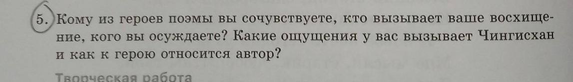 Клира 5. Кому из героев поэмы вы сочувствуете, кто вызывает ваше сите ние, кого вы осуждаете? Какие сущения у вас вызывает Чингисхан и как и герою сутносится автор?