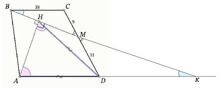 Найдите длину отрезка AD, если известно, что BC=18, CM=9, MD=11.