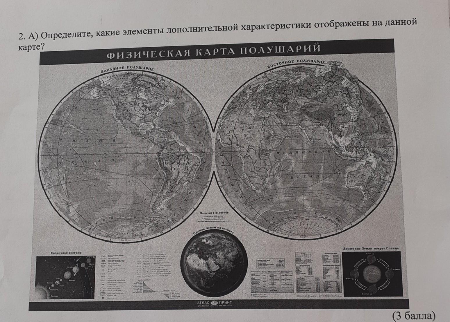 2. А) Определите, какие элементы лополнительной характеристики отображены на данной карте? ФИЗИЧЕСКАЯ КАРТА ПОЛУШАРИЙ ЗАПАДНОЕ. полУШАРНЕ восточное полУШАРНЕ - Мен немесе 3e3 ECNO Саме Салее че се е Дене ене аман еке сове is lates 11