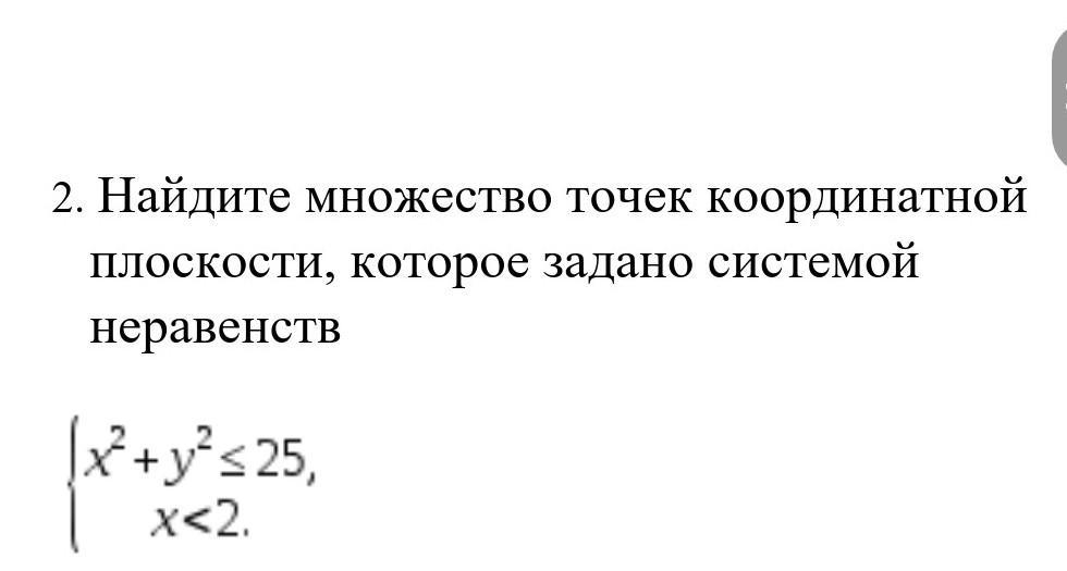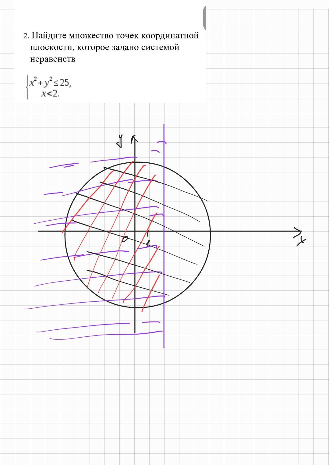 Решением системы будет множество точек на и в середине круга, лежащие слева от прямой х=2, точки этой прямой не входят в множество решений, так как неравенство строгое