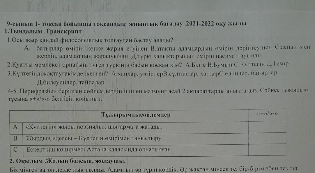9-сынып 1- тоқсан бойынша тоқсандық жиынтық бағалау .2021-2022 оқу жылы