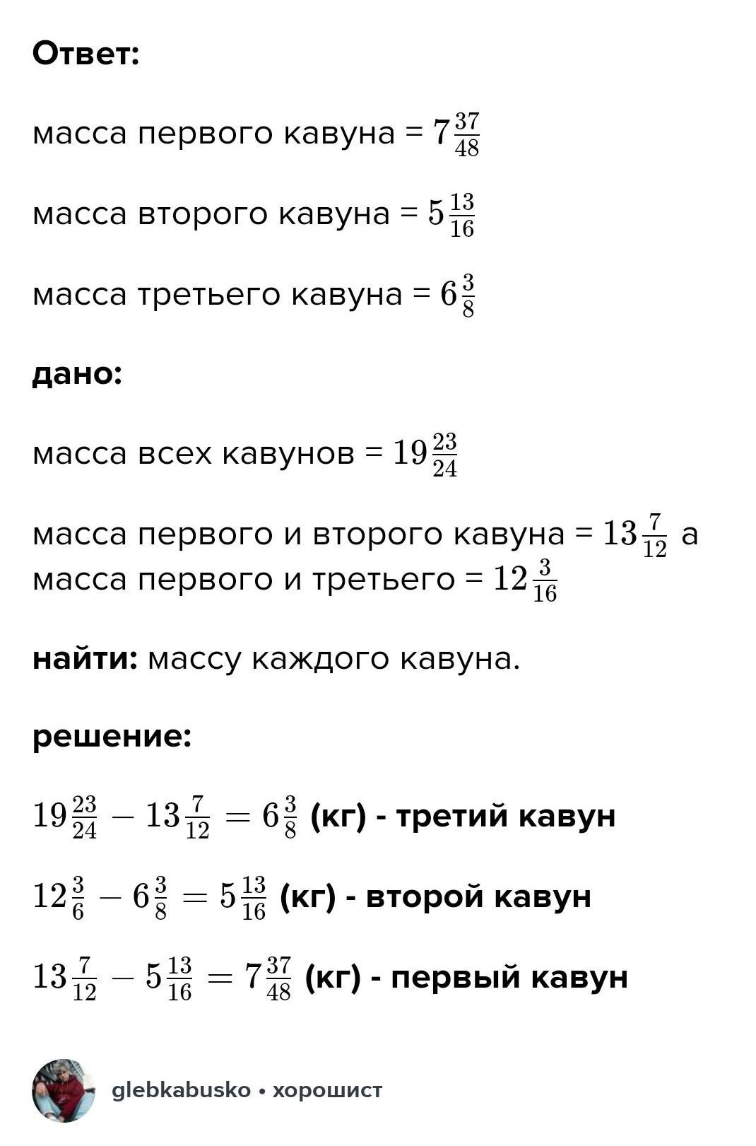 маса трьох кавунів дорівнює 19 23/24 кг маса першого і другого 13 7/12 кг, а першого і третього 12 3/16. знайдіть масу кожного кавуна окремо