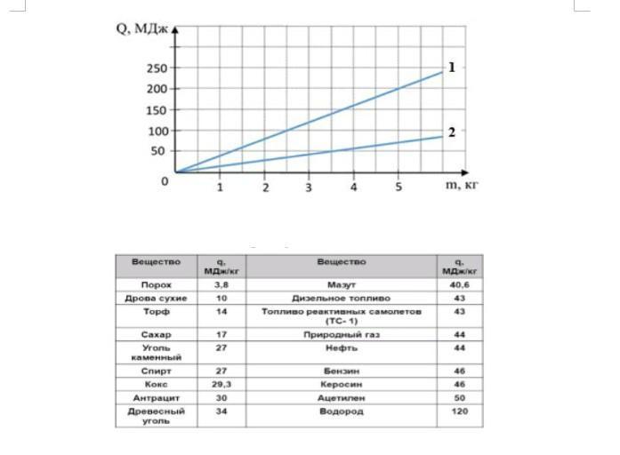 Рассмотрите график зависимости количества теплоты, выделяющегося при сгорании топлива, от массы топлива. Определите по таблице, для каких видов топлива эти графики.