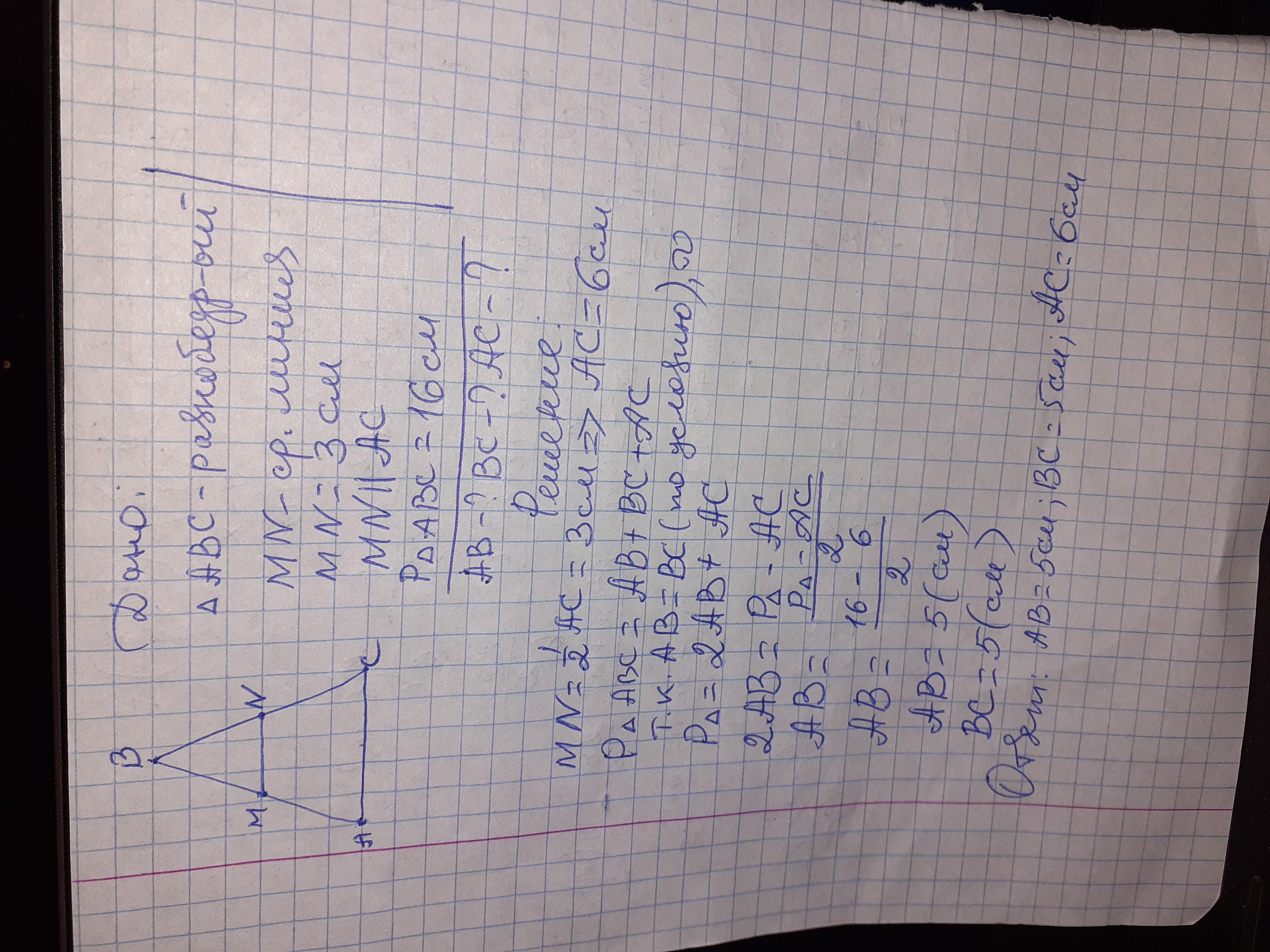 средняя линия равнобедренного треугольника, параллельная основанию, равна 3 см. найдите стороны треугольника, если его периметр равен 16 см
