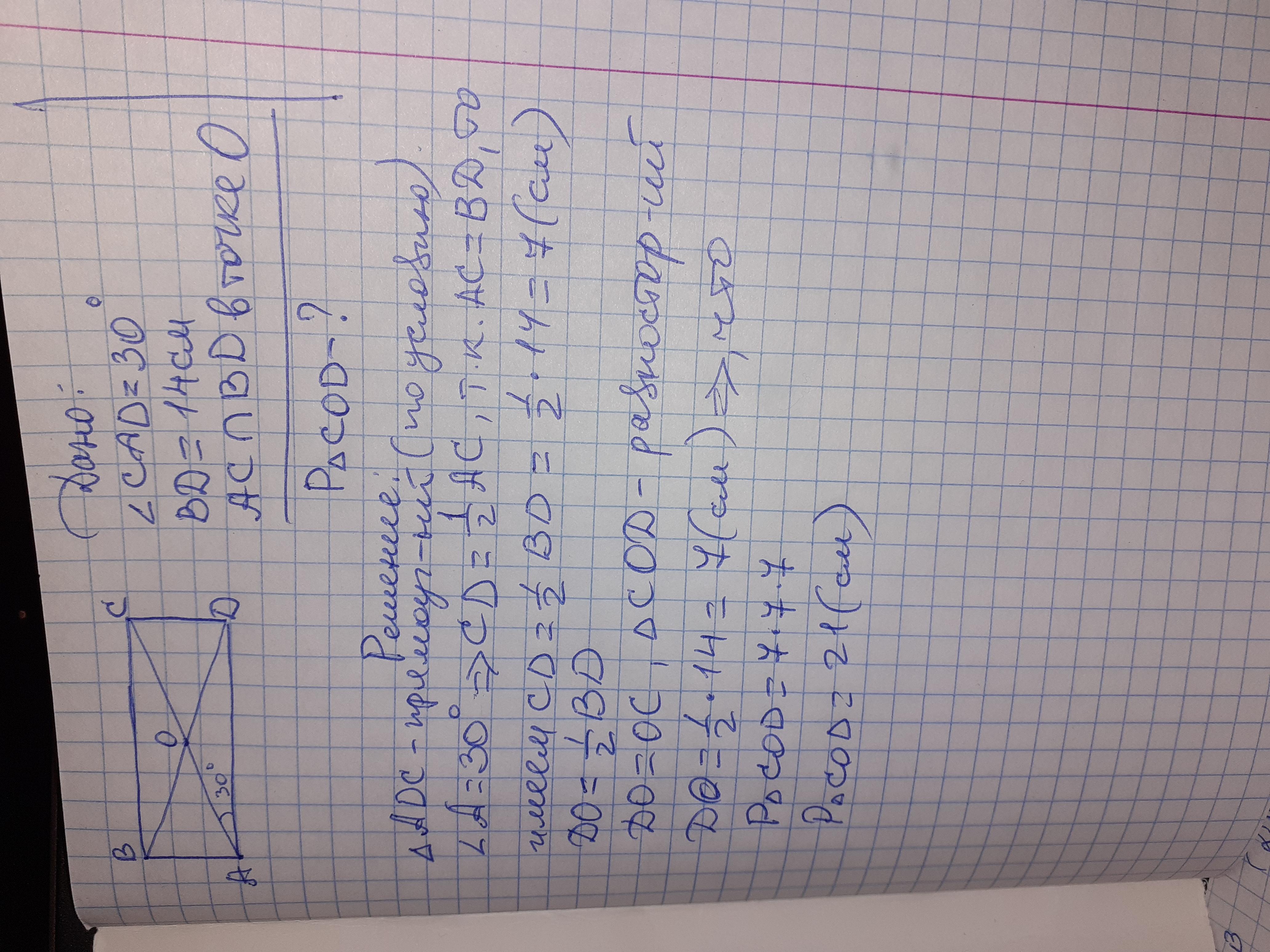 В прямоугольнике ABCD диагонали пересекаются в точке О. найдите периметр треугольника СОD если <CAD=30°,BD=14°
