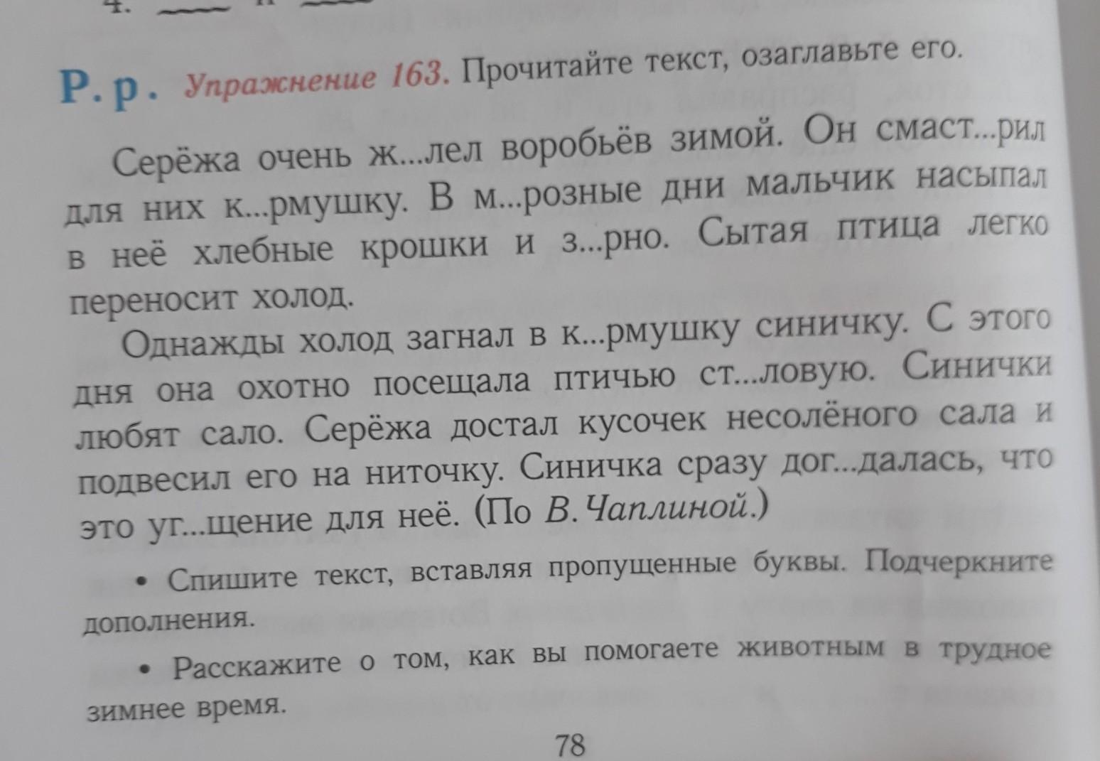 P. p. Упражнение 163. Прочитайте текст, озаглавьте его. Серёжа очень ж...лел воробьёв зимой. Он смаст...рил для них к...рмушку. В м...розные дни мальчик насыпал в неё хлебные крошки и з...рно. Сытая птица легко переносит ХОЛОД. Однажды холод загнал в к...рмушку синичку. С этого дня она охотно посещала птичью ст...Ловую. Синички любят сало. Серёжа достал кусочек несолёного сала и Подвесил его на ниточку. Синичка сразу ДОГ...далась, что это уг...щение для неё. (По В. Чаплиной.) • Спишите текст, вставляя пропущенные буквы. Подчеркните Дополнения. • Расскажите о том, как вы помогаете животным в трудное зимнее время. 78