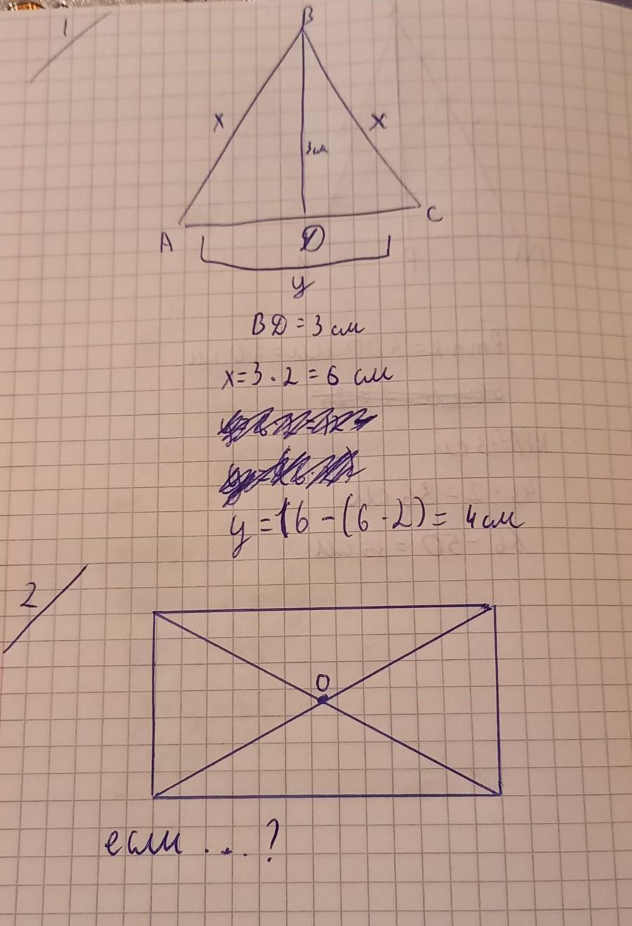средняя линия равнобедренного треугольника, параллельная основанию, равна 3 см. найдите стороны треугольника, если его периметр равен 16 см 2) задание В прямоугольнике ABCD диагонали пересекаются в точке О. найдите периметр треугольника СОD если