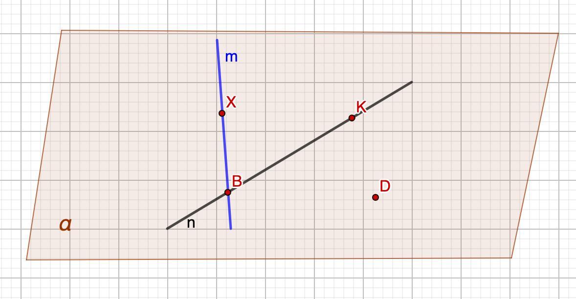 а) Выполните построение: В плоскости α проведите прямую n. Отметьте точки B, D, К, Х при условии, что точки В и К принадлежат прямой n, а точки Х и D не принадлежат прямой n и лежат в разных полуплоскостях относительно прямой n. Через точки Х, В проведите прямую m.