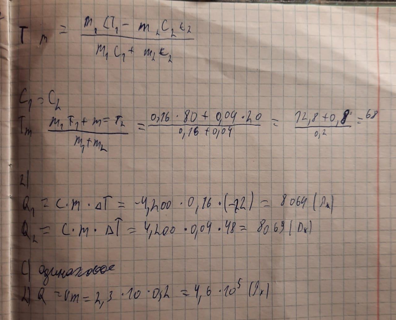 b) Какое количество теплоты отдала горячая вода холодной, и какое количество теплоты получила холодная вода от горячей? (с= 4200Дж/кг С)
