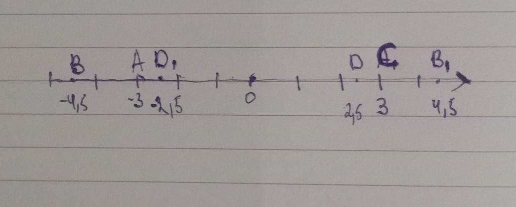 4. а) На координатной прямой отметьте точки А(-3), B(-4,5), C(3), D(2,5). б) Укажите точки с противоположными координатами.