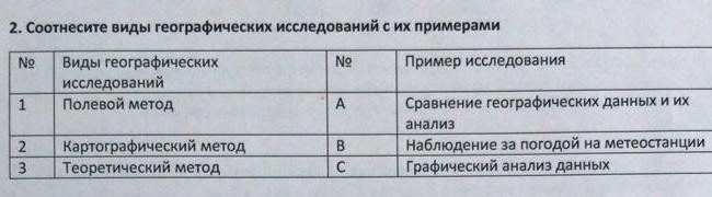 2. Соотнесите виды географических исследований с их примерами No Виды географических No исследований 1 Полевой метод 2 Картографический метод Теоретический MeTOД 3 A B C Пример исследования Сравнение географических данных и их анализ Наблюдение за погодой на метеостанции Графический анализ данных