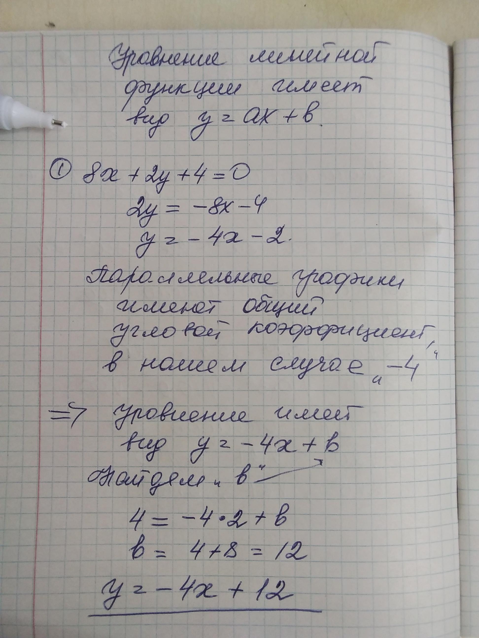 Вырази линейную функцию, график которой параллелен графику линейной функции 8x+2y+4=0 и проходит через точку M(2;4), через формулу.