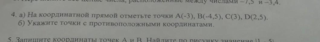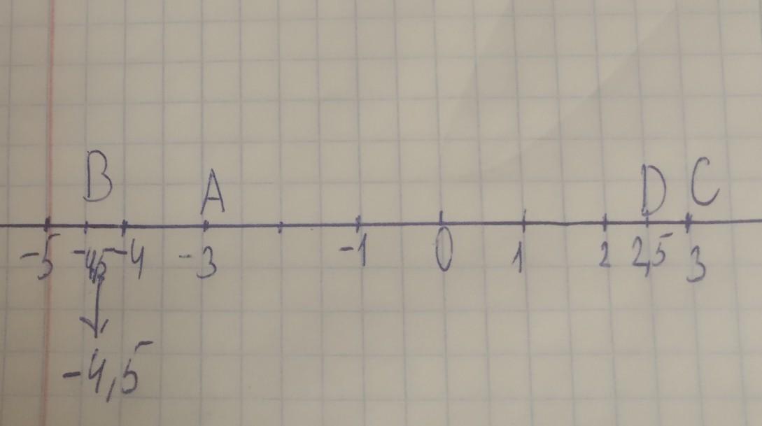 4. а) На координатной прямой отметьте точки А(-3), В(-4,5), C(3), D(2,5). б) Укажите точки с противоположными координатами.