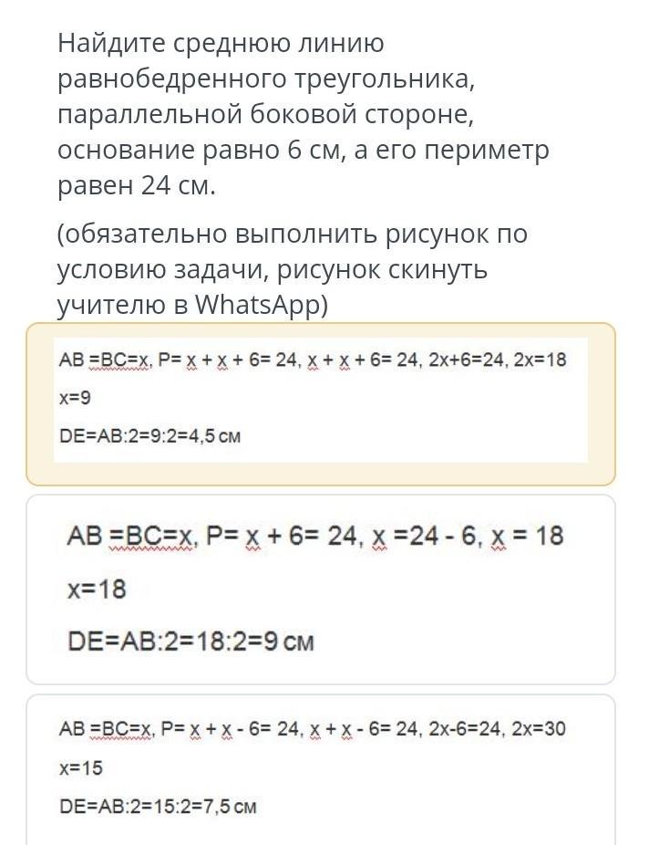 Так как средняя линия равна 1/2 параллельной ей стороне, получается,