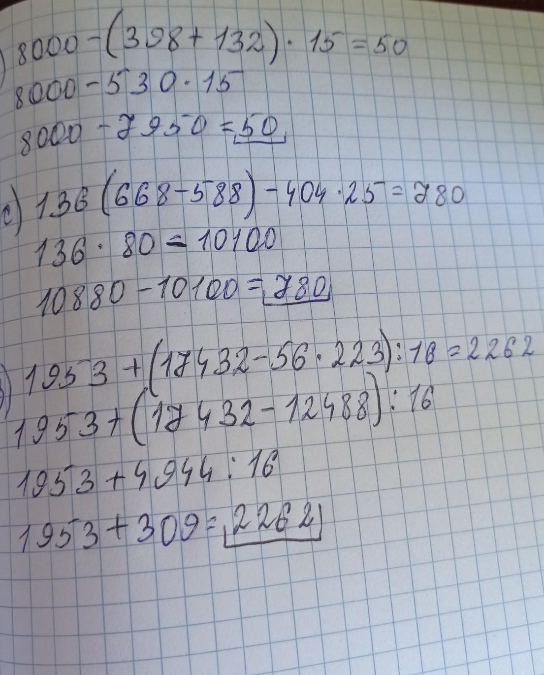 а) 66 * 24 : 22 + 17017: 17; B) 9 * (1030 - 579) + 941; д) (770 - 669) * (546 – 489); ж) 1540 : 11 + 1890 : 9 + 982; б) (42 · 25 - 36): 39 + (800 : 40 - 18) * 12. г) 8000 - (398 + 132) * 15; e) 136 (668 - 588) - 404 * 25 з) 1953 + (17432 - 56 * * 223) : 16
