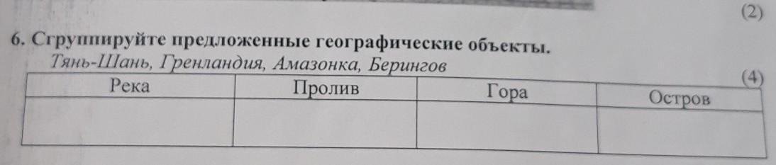 (2) ( 6. Сгруппируйте предложенные географические объекты. Тянь-Шань, Гренландия, Амазонка, Берингов Река Пролив Гора (4 4 Остров