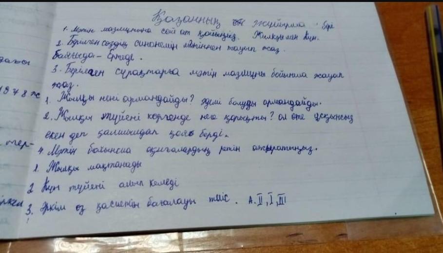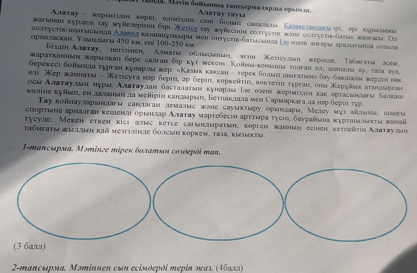«Қазақ тілі мен әдебиеті та» пәнінен 1-тоқсан бойынша жиынтық бағалау тапсырмалары Оқушының аты-жөні ЯҒНИ Тыңдалым: Мәтінді мұқият тыңда. Мәтін бойынша тапсырмаларды орында. Алатау тауы Алатау жеріміздің көркі, еліміздің сәні болып саналады. Қазақстандағы ірі, әрі құрылымы жағынан күрделі тау жүйелерінің бірі. Жетісу тау жүйесінің солтүстік және солтүстік-батыс жалғасы. Ол солтүстік-шығысында Алакөл қазаншұңқыры мен оңтүстік-батысында Іле өзені аңғары аралығында созыла орналасқан. Ұзындығы 450 км, ені 100-250 км. Біздің Алатау, негізінен, Алматы облысының, Жетісудың жерінде. Табиғаты әсем, жаратқанның жарылқап бере салған бір құт мекені. Қойны-қонышы толған ел, Шипалы су, таза ауа, берекесі бойында тұрған құнарлы жер. «Қазық қақсаң – терек болып шығатын» бау-бақшалы жердің нақ өзі. Жер жәннаты Жетісуға нәр беріп, әр беріп, көркейтіп, көктетіп тұрған, оны Жерұйық атандырған осы Алатаудың нұры. Алатаудан басталатын құнарлы Іле өзені жеріміздің қақ ортасындағы Балқаш көліне құйып, ен даланың да мейірін қандырып, Бетпақдала мен Сарыарқаға да нәр беріп тұр. Тау қойнауларындағы сандаған демалыс және сауықтыру орындары, Медеу мұз айдыны, шаңғы спортына арналған кешенді орындар Алатау мәртебесін арттыра түсіп, баурайына жұртшылықты жинай түсуде. Мекен еткен кісі алыс кетсе сағындыратын, көрген жанның есінен кетпейтін Алатаудың табиғаты жылдың қай мезгілінде болсын көркем, таза, қызықты. 1-тапсырма. Мәтінге тірек болатын сөздерді тап.