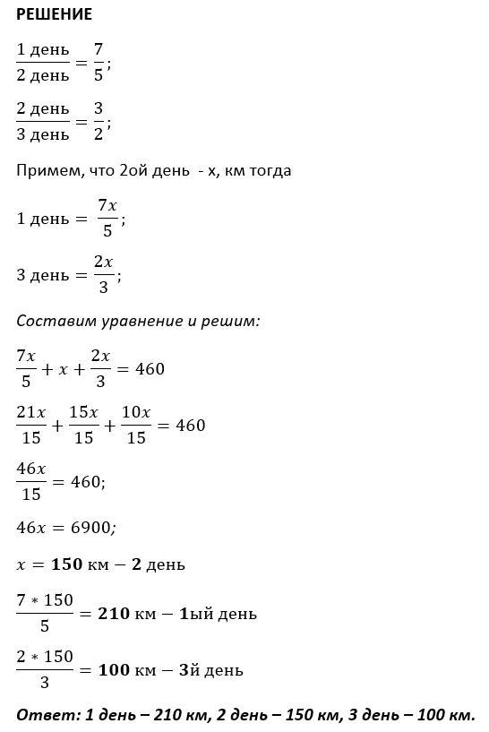 Путешественники за 3 дня проехали 460 км.Путь путешественников в 1 день относится к пути во 2 день, как 7:5 .Отношение пути путешественников во 2 день к пути в 3 день равно 3:2 .Сколько км проехали путешественники в 1 , 2 ,3 день?
