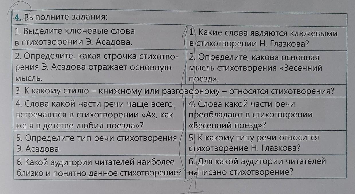 МЫСЛЬ. 4. Выполните задания: 1. Выделите ключевые слова 1) Какие слова являются ключевыми в стихотворении Э. Асадова. в стихотворении Н. Глазкова? 2. Определите, какая строчка стихотво- 2. Определите, какова основная рения Э. Асадова отражает основную мысль стихотворения «Весенний поезд». 3. К какому стилю — книжному или разговорному – относятся стихотворения? 4. Слова какой части речи чаще всего 4. Слова какой части речи Встречаются в стихотворении «Ах, как преобладают в стихотворении же я в детстве любил поезда»? «Весенний поезд»? 5. Определите тип речи стихотворения 5. К какому типу речи относится Э. Асадова. Стихотворение Н. Глазкова? 6. Какой аудитории читателей наиболее 6. Для какой аудитории читателей близко и понятно данное стихотворение? написано стихотворение?