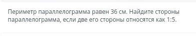 Пириметр параллеграмма равен 36 см. : Найдите стороны параллеграмма если две их стороны относиться как 1:5