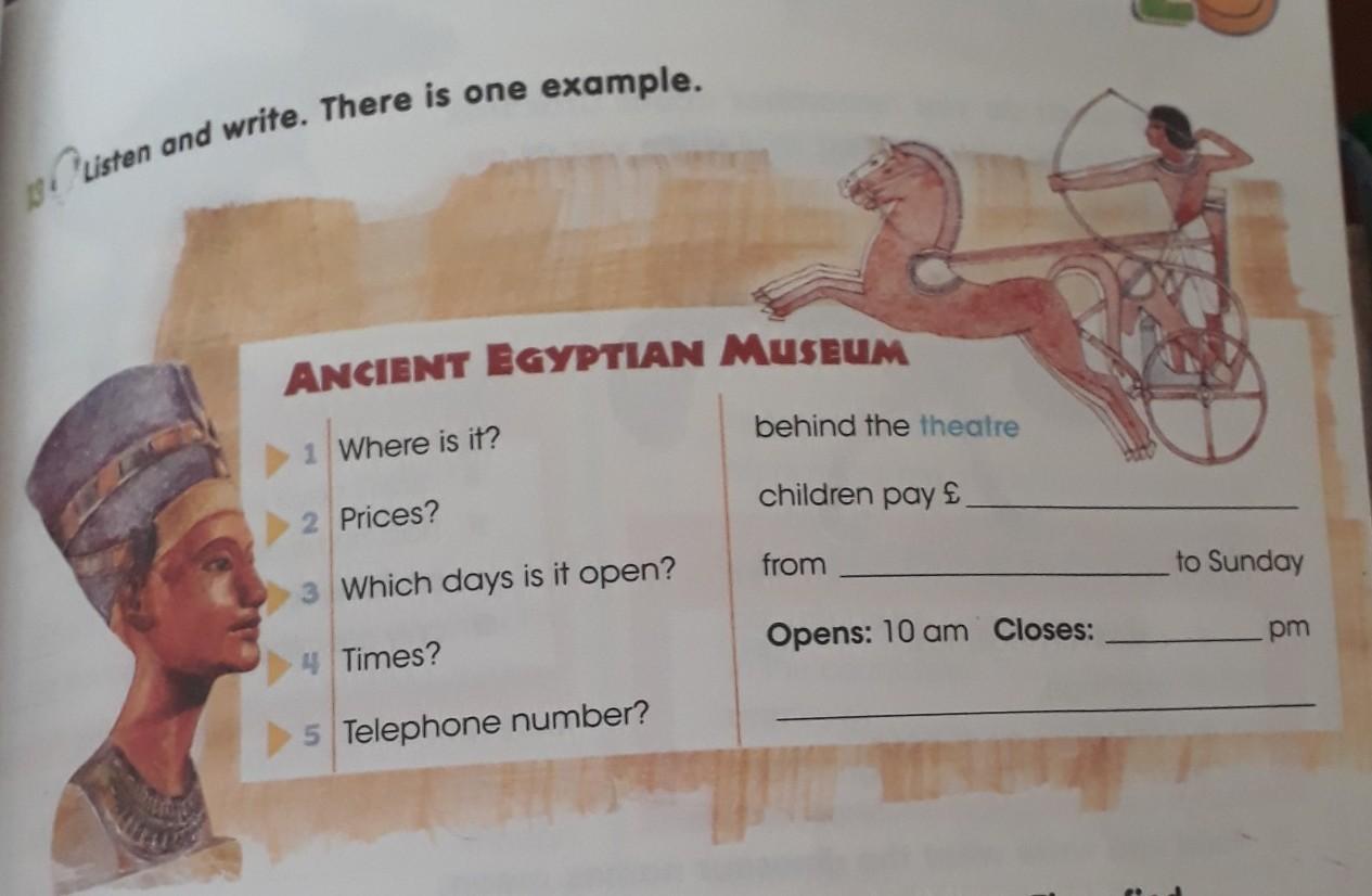 13 Listen and write. There is one example. ANCIENT EGYPTIAN MUSEUM 1 Where is it? behind the theatre 2 Prices? children pay £ 3 Which days is it open? from to Sunday 4 Times? Opens: 10 am Closes: pm 5 Telephone number?