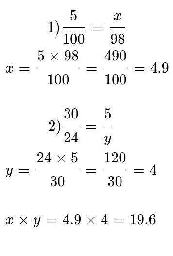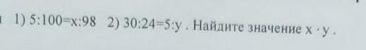 задана пропорция 1) 5:100=х:98 2) 30:24 = 5:y Найдите значения х• у