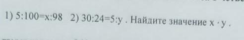 задана пропорция 1) 5:100=х:98 2) 30:24 = 5:y Найдите значения х• у с решением напишите пожалуйста! спасибо заранее.