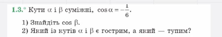 Ответ:1. Косинуси суміжних кутів рівні за модулем, але мають протилежні знаки ( згідно тригонометричним співвідношенням). Тому, cos бетта= 1/6.