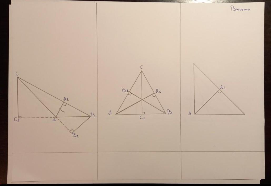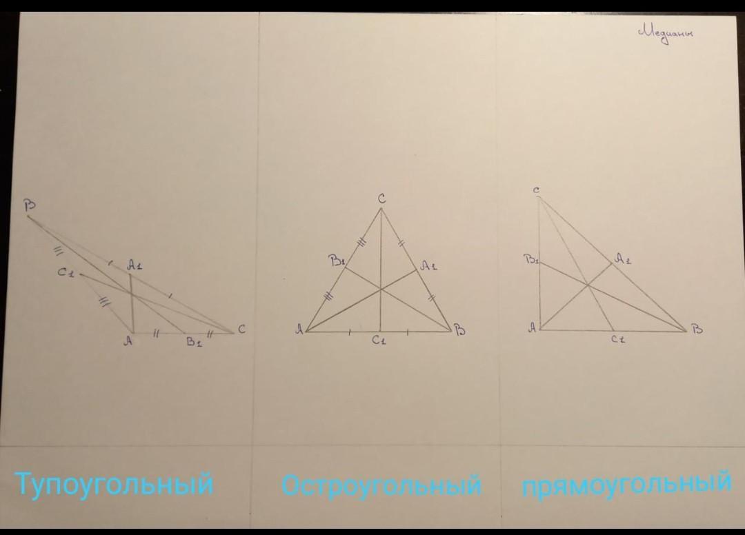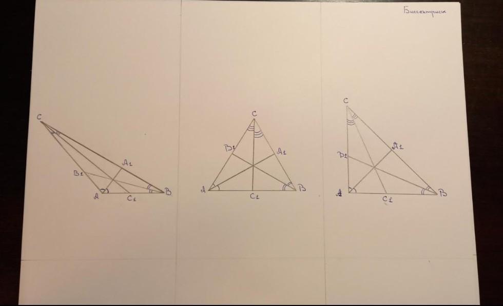 на листе А4 начертить три треугольника, в каждом начертить отрезки. первом три медианы, во втором три биссектрисы, в третьем три высоты.