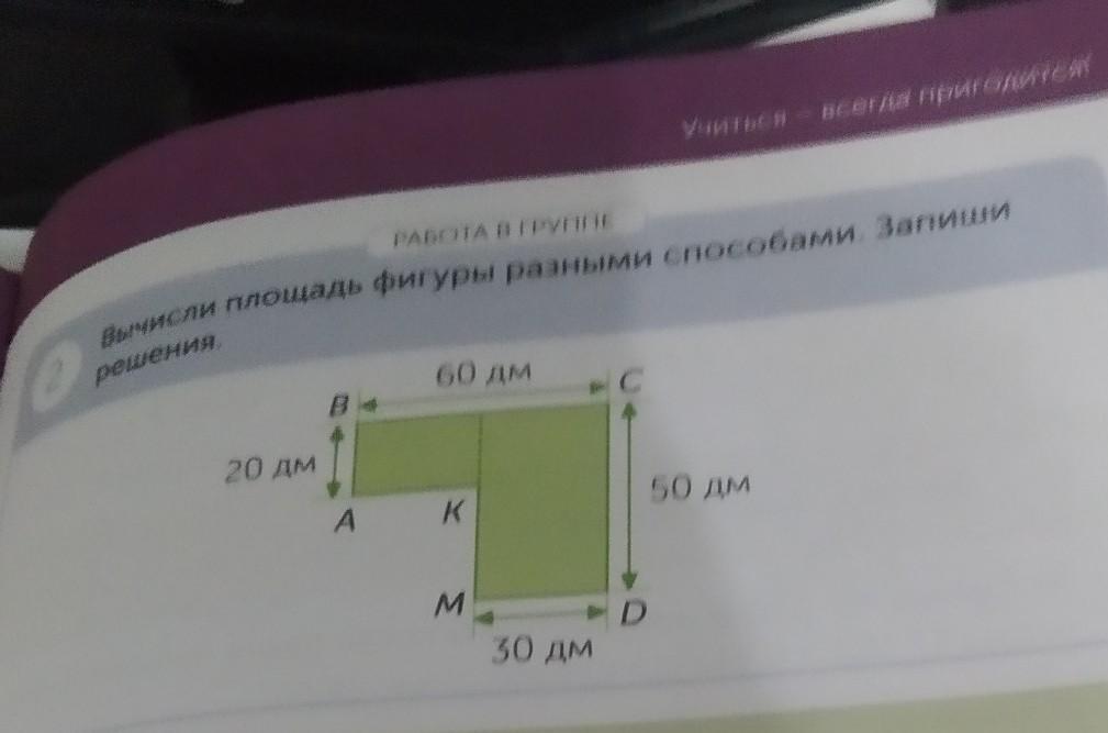 РАБОТА В ГРУППЕ Вычисли площадь фигуры разными способами. Запиши 2 решения. 60 дм B C 20 дм A K 50 дм M D 30 дм ТАМ НАДО ДАНО И РЕШЕНИЕ МОЖНО ПЛИС ТОЛЬКО ДАНО Я ЗНАЮ КАК РЕШАТЬ Я НЕ МОГУ ПОНЯТЬ КАК ПИШЕТСЯ ДАНОООО!!!!!