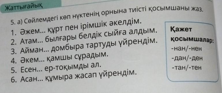 1.Әжемнен құрт пен ірімшік әкелдім. 2.Атамнан былғары белдік сыйға алдым. 3.Айманнан домбыра тартуды үйрендім. 4.Әкемнен қамшы сұрадым. 5.Есеннен ер‐тоқымды ал. 6.Асаннан құмыра жасап үйрендім.