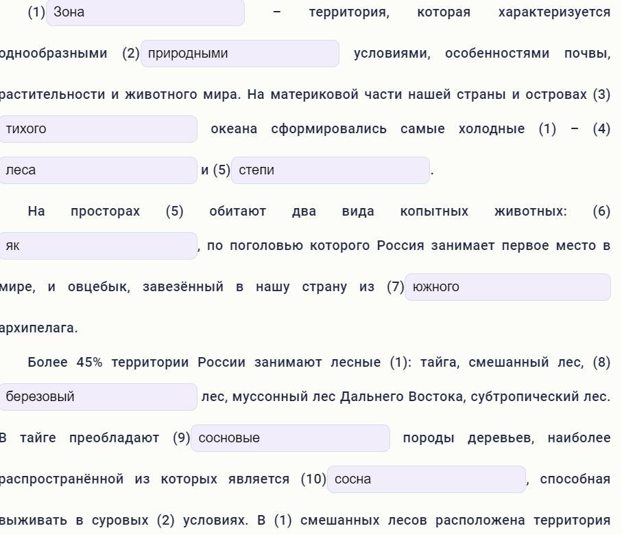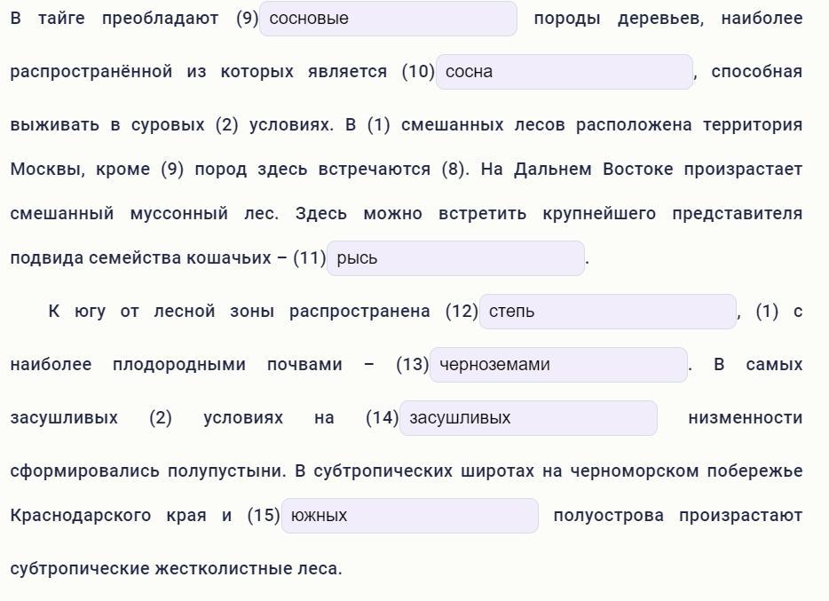 Более 45 % территории России занимают лесные (1): тайга, смешанный лес, (8) лес, муссонный лес Дальнего Востока, субтропический лес. В тайге преобладают (9) породы деревьев, наиболее распространённой из которых является (10), способная выживать в суровых (2) условиях. В (1) смешанных лесов расположена территория Москвы, кроме (9) пород здесь встречаются (8). На Дальнем Востоке произрастает смешанный муссонный лес. Здесь можно встретить крупнейшего представителя подвида семейства кошачьих – (11).