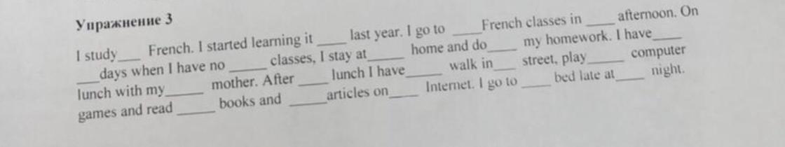 I study French. I started learning in last year. I go to French classes in the afternoon. On days when i have no classes. I stay at the home and i do my homework. I have the lunch with my mother. After a lunch i have the walk in street, play CGs and read the books adn articles in the Internet. I go to bed late at night.