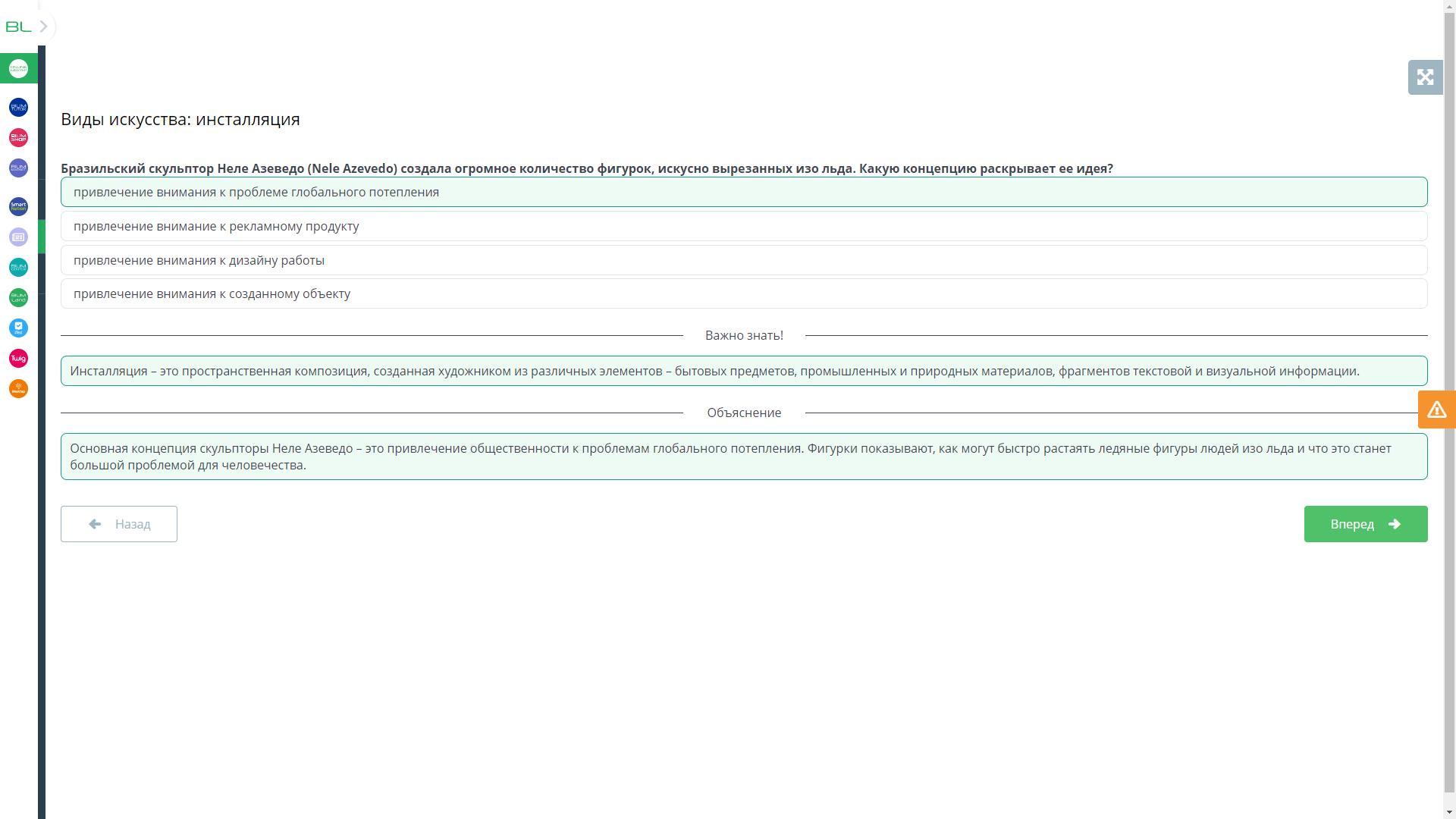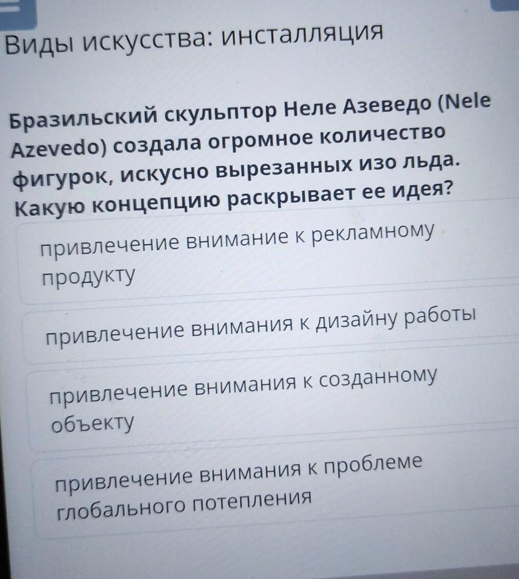 Виды искусства: инсталляция Бразильский скульптор Неле Азеведо (Nele Azevedo) создала огромное количество фигурок, искусно вырезанных изо льда. Какую концепцию раскрывает ее идея? привлечение внимание к рекламному продукту привлечение внимания к дизайну работы привлечение внимания К созданному объекту привлечение внимания к проблеме глобального потепления пжж