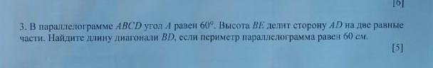 [6] 3. В параллелограмме ABCD угол А разен 60°. Высота BE делит сторону АД на две ранные части. Найдите длину диагонали BD, если периметр параллелограмма равез 60 см.