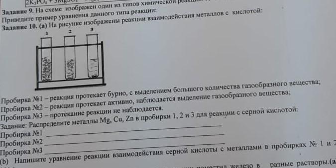 На рисунке изображены реакции взаимодействия металла с кислотой реакция протекает с выделением большого количества газообразного вещества реакция протекает активно наблюдается выделение газообразного вещества протекания реакции не наблюдается Распределите металлы mg,cu,zn пробирки 1,2 и 3 это реакция с серной кислотой