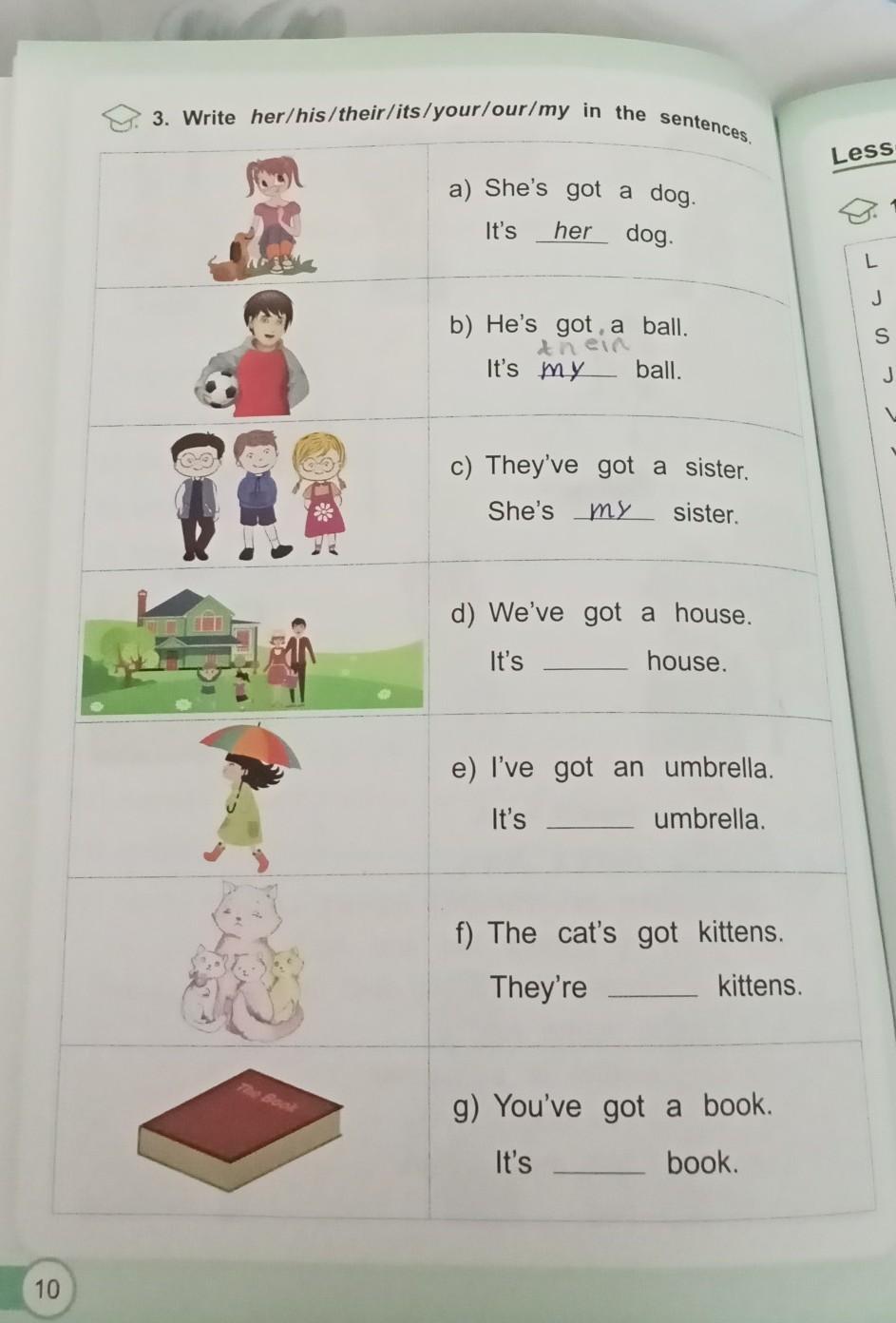 3. Write her/his/their/its/your/our/my in the sentencer Less a) She's got a dog. It's her dog. L J b) He's got a ball. s It's my ball. c) They've got a sister. She's my sister d) We've got a house, It's house. e) I've got an umbrella. It's umbrella. f) The cat's got kittens. They're kittens. The Book g) You've got a book. It's book
