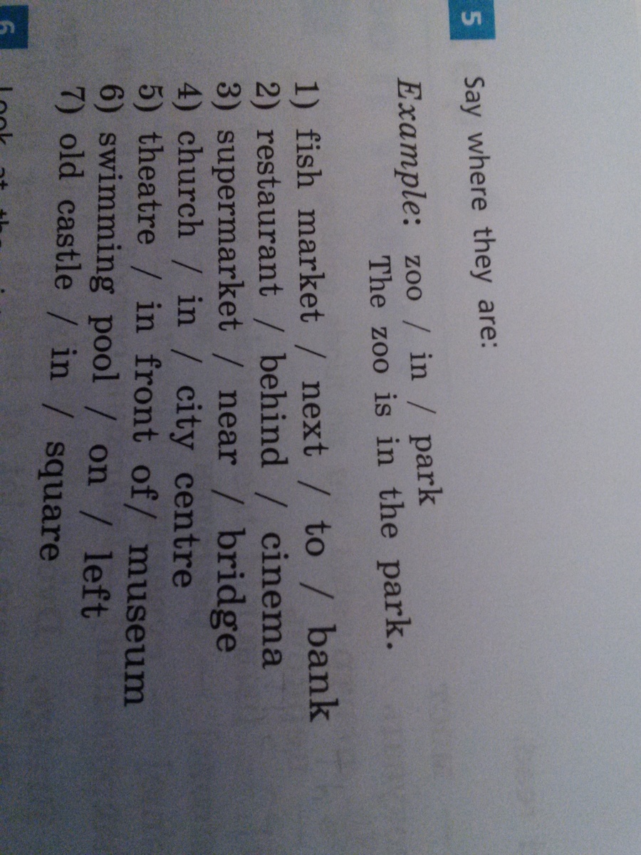 1. the fish market next to the bank 2. the restaurent is behind he cinema 3/ the supermarket is near the bridge