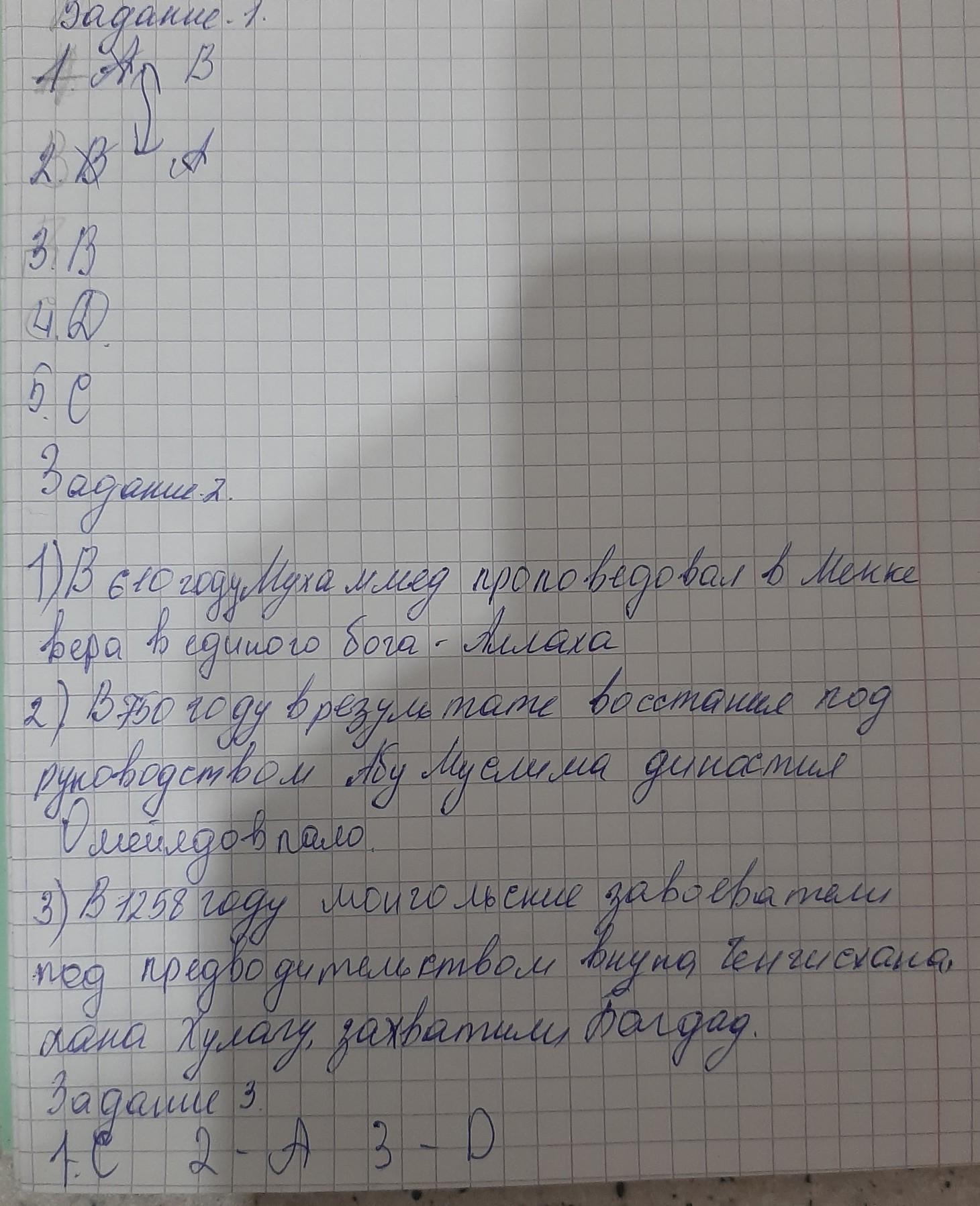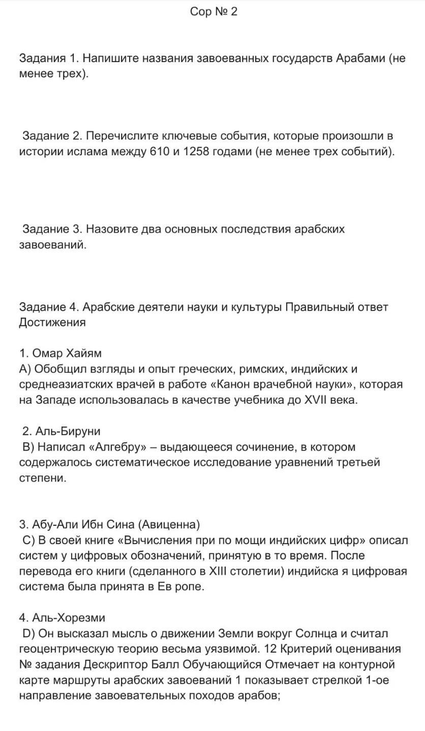 Задания 1. Напишите названия завоеванных государств Арабами (не менее трех). Задание 2. Перечислите ключевые события, которые произошли в истории ислама между 610 и 1258 годами (не менее трех событий). Задание 3. Назовите два основных последствия арабских завоеваний. Задание 4. Арабские деятели науки и культуры Правильный ответ Достижения 1. Омар Хайям А) Обобщил взгляды и опыт греческих, римских, индийских и среднеазиатских врачей в работе «Канон врачебной науки», которая на Западе использовалась в качестве учебника до XVII века. 2. Аль-Бируни В) Написал «Алгебру» – выдающееся сочинение, в котором содержалось систематическое исследование уравнений третьей степени. 3. Абу-Али Ибн Сина (Авиценна) С) В своей книге «Вычисления при по мощи индийских цифр» описал систем у цифровых обозначений, принятую в то время. После перевода его книги (сделанного в XIII столетии) индийска я цифровая система была принята в Ев ропе. 4. Аль-Хорезми D) Он высказал мысль о движении Земли вокруг Солнца и считал геоцентрическую теорию весьма уязвимой. 12 Критерий оценивания № задания Дескриптор Балл Обучающийся Отмечает на контурной карте маршруты арабских завоеваний 1 показывает стрелкой 1-ое направление завоевательных походов арабов;