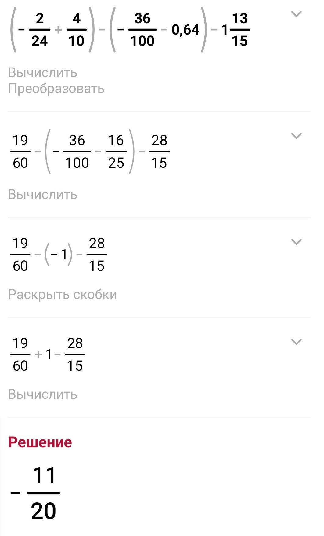Помогите решить даю 20 балов!!!!!!!!!!!(-2/24+4/10)-(-36/100-0,64)-1 целая 13/15