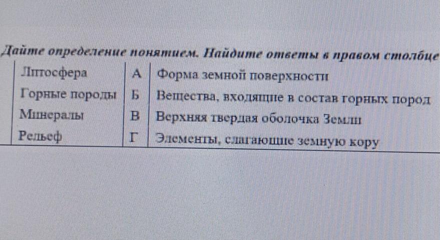 . ПОЖАЛУЙСТА СРОНО НУЖНО .Дайте определение понятием. Найдите ответы в правом столбце таблицы: 1 Лотосфера A Форма земной поверхності 2 Горные породы Б | Вещества, входящие в состав горных пород 3 Минералы в Верхняя твердая оболочка Зеш 4 Рельеф г Элементы, слагаюшие земную кору