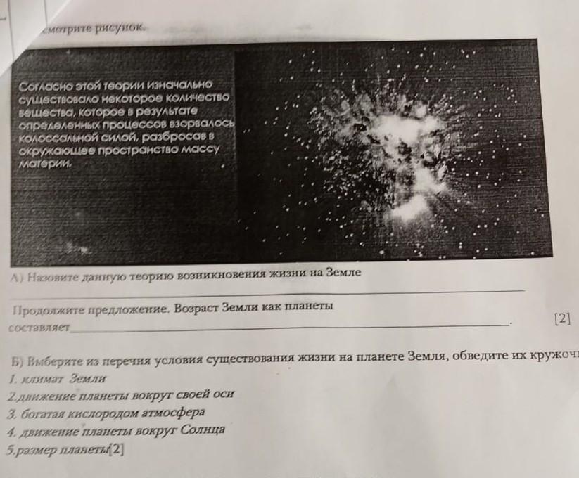 Рассмотрите рисунок. Согласно этой теории изначально существовало некоторое количества веществая, которое в результате определенных процессов взорвалась колоссальной силой , разбросав в окружающее пространство массу материи. А)Назовите данную теорию возникновения жизни на земле.Продолжите предложение.Возраст земли как планеты составляет