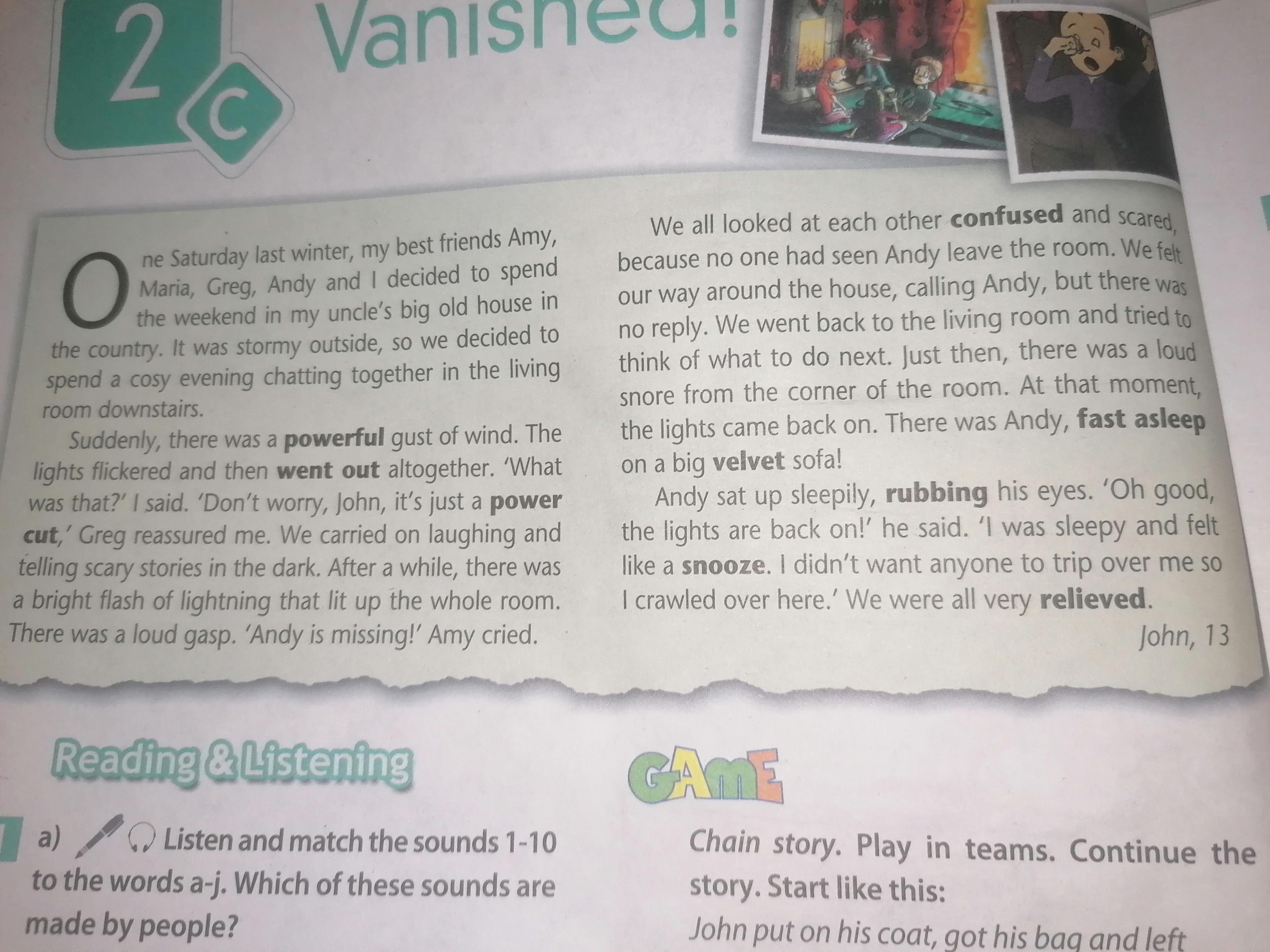 on weekends my friends and I rested. lightning flashed and the electricity was cut off abruptly. at first everyone was scared and confused. we put fear into play. we started telling horror stories in the dark and laughing. all of a sudden, at one point, Amy screamed that andy was missing. all the guys looked around and didn't see andy. frightened guys started looking for him. suddenly turn on the light and everyone sees andy sleeping on the couch, he says, "I wanted to sleep, but I didn't want you to stumble over me, so I lay down here." all the guys became happy and cheerful after andy was found.