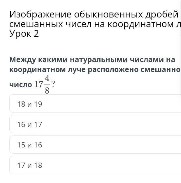 Изображение обыкновенных дробей и смешанных чисел на координатном луче. Урок 2 Между какими натуральными числами на координатном луче расположено смешанное число 18 и 19 16 и 17 15 и 16 17 и 18 Назад Проверить
