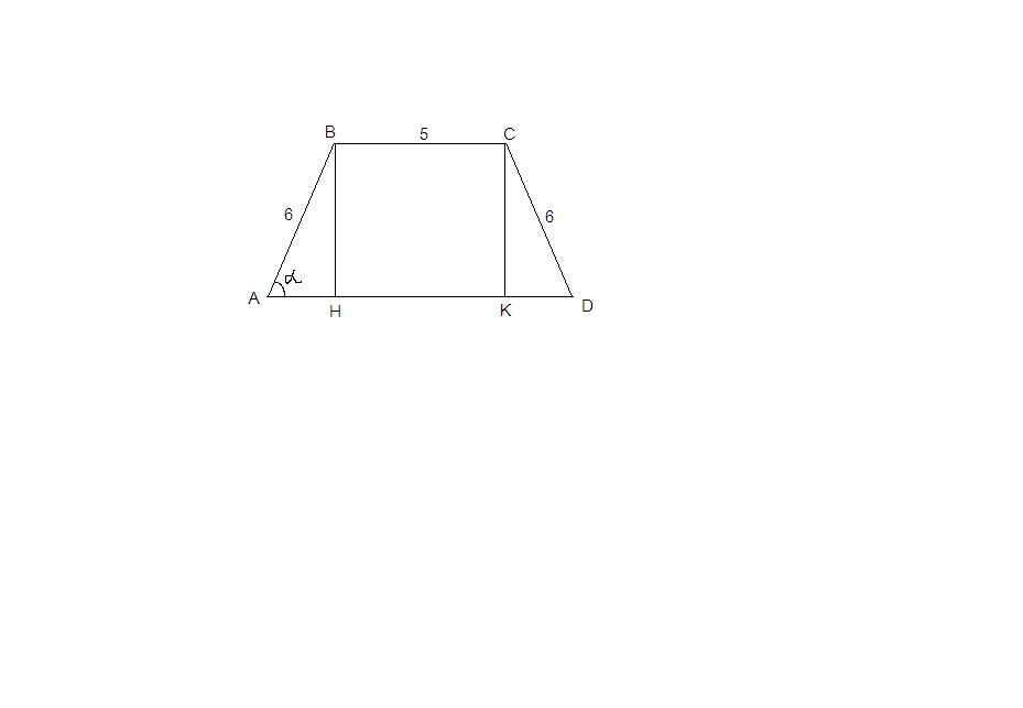 ΔАВН = ΔDCK по гипотенузе и острому углу (AB = CD как боковые стороны равнобедренной трапеции, ∠ВАН = ∠CDK как углы при основании равнобедренной трапеции), значит, АН = DK = 6cosα.