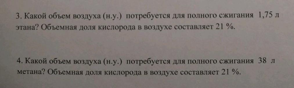 3. Какой объем воздуха (н.у.) потребуется для полного сжигания 1,75 л этана? Объемная доля кислорода в воздухе составляет 21%.