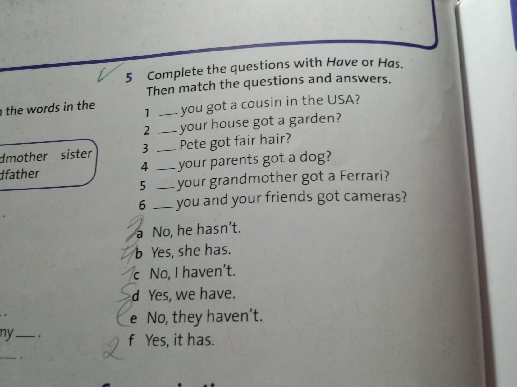 complete the questions with Have or Has. Then match the questions ad answers. пожалуйста срочно!!