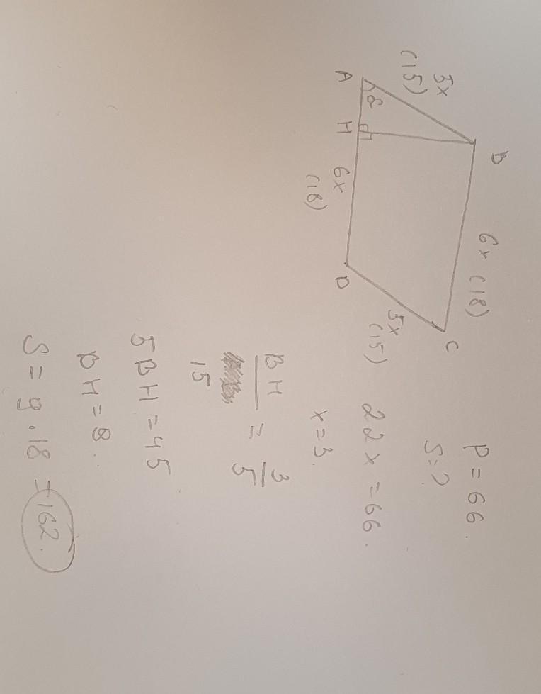 периметр параллелограмма равен 66 см угол AB:AD=5:6, угол А острый, sinA 3/5. Найдите площадь параллелограмма