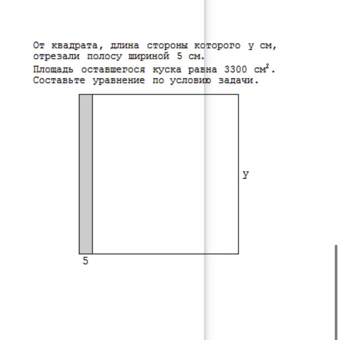 Остался прямоугольник со сторонами: y и y-5. Значит, его площадь: y (y-5). А по условию эта площадь 3300. Уравнение: y (y-5) = 3300,