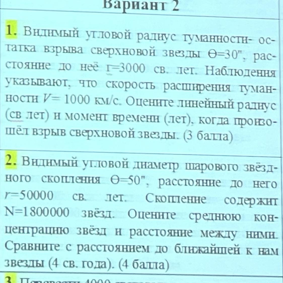 Видимый угловой радиус туманности остатка взрыва сверхновой звезды θ=30’’, расстояние до нее г=3000 св. лет. Наблюдения указывают, что скорость расширения туманности V=1000км/с. Оцените линейный радиус (св.лет) и момент времени (лет), когда произошел взрыв сверхновой звезды.
